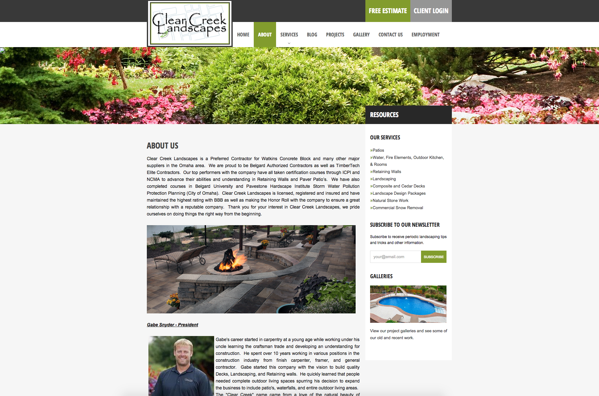 If you've seen a Clear Creek Landscapes project you know that they do not spare any attention when it comes to detail. It was for this very reason Clear Creek Landscapes sought out a development firm who could match their high expectation for elegance and perfection. Naturally our design team hit the ground sprinting and within a few weeks Clear Creek Landscapes had a brand new and enhanced online brand for them to call home.