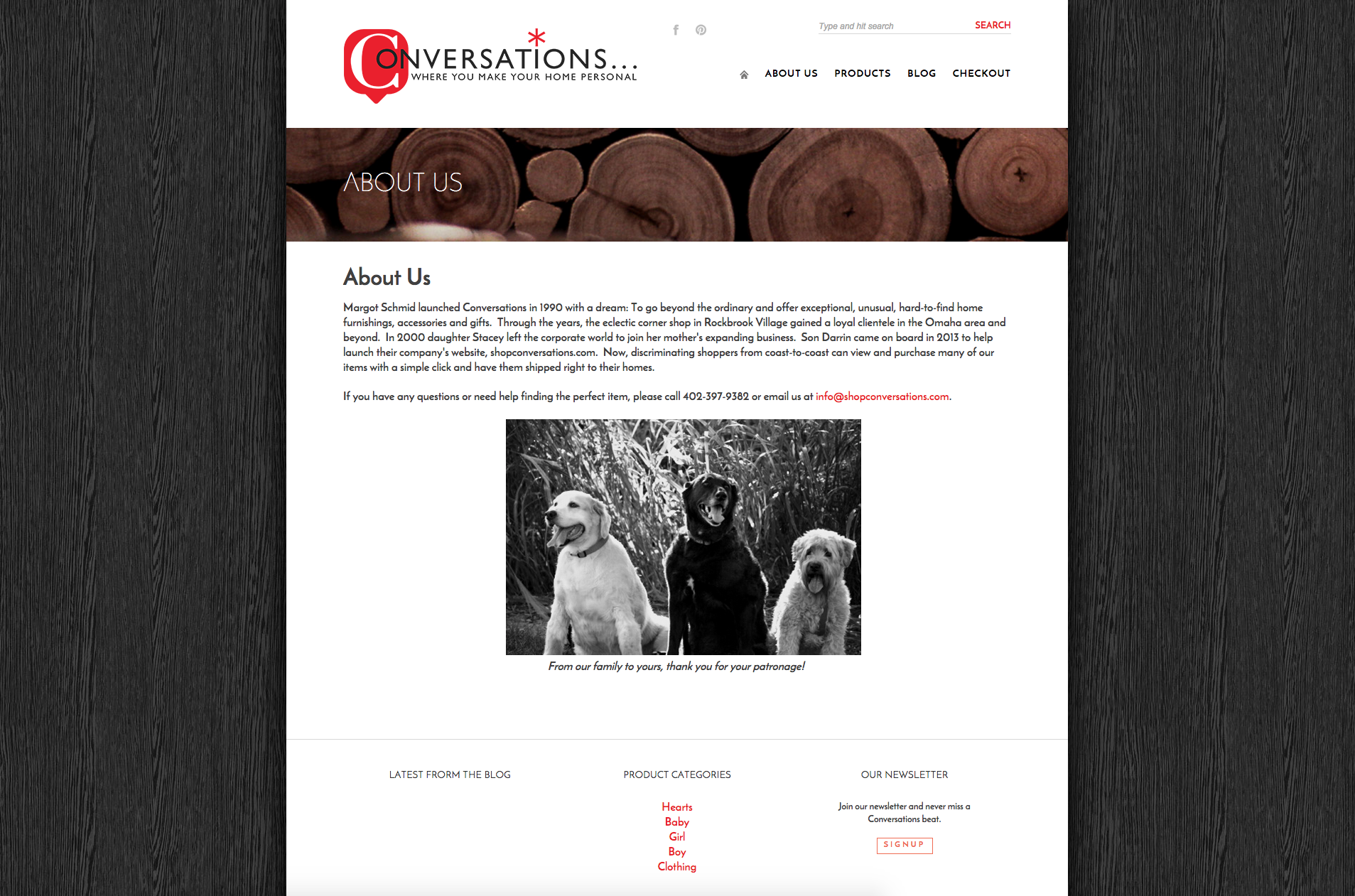 Margot Schmid launched Conversations in 1990 with a dream: To go beyond the ordinary and offer exceptional, unusual, hard-to-find home furnishings, accessories and gifts. Through the years, the eclectic corner shop in Rockbrook Village gained a loyal clientele in the Omaha area and beyond. Margot Schmid launched Conversations in 1990 with a dream: To go beyond the ordinary and offer exceptional, unusual, hard-to-find home furnishings, accessories and gifts. Through the years, the eclectic corner shop in Rockbrook Village gained a loyal clientele in the Omaha area and beyond. In 2000 daughter Stacey left the corporate world to join her mother's expanding business. Son Darrin came on board in 2013 to help launch their company's website, shopconversations.com. Now, discriminating shoppers from coast-to-coast can view and purchase many of our items with a simple click and have them shipped right to their homes.