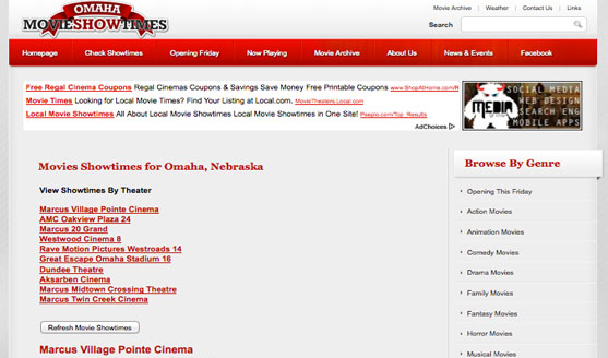 OmahaMovieShowtimes.com is Omaha's leading moviegoer destination, displays movie showtimes, information, and events to thousands and thousands of unique visitors each month. OmahaMovieShowtimes.com just recently partnered up with The Reader Magazine to create a one of a kind movie goer destination that will entertain and inform consumers with exclusive film clips, trailers, celebrity interviews, fan reviews and news, while offering the ability to quickly select a film and conveniently.