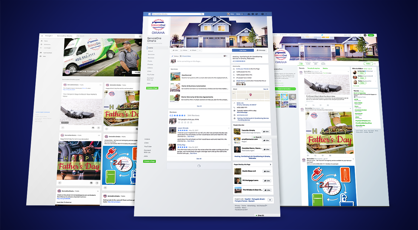 In addition to the new website, the Monsters at OMG also manage multiple social media profiles for both of ServiceOne's locations, including Twitter, Google+, LinkedIn, Facebook, and Instagram.