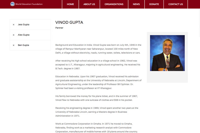 Over the last 20 years, Vinod Gupta has donated over $50 million in philanthropic purposes. He plans to give more of his net worth to charity in the future. Mr. Gupta recognizes the role of education in developing the leaders of tomorrow. Through his charitable foundation, he has helped advance education across fields including: business, science, information technology, communications, intellectual property law and wildlife preservation.